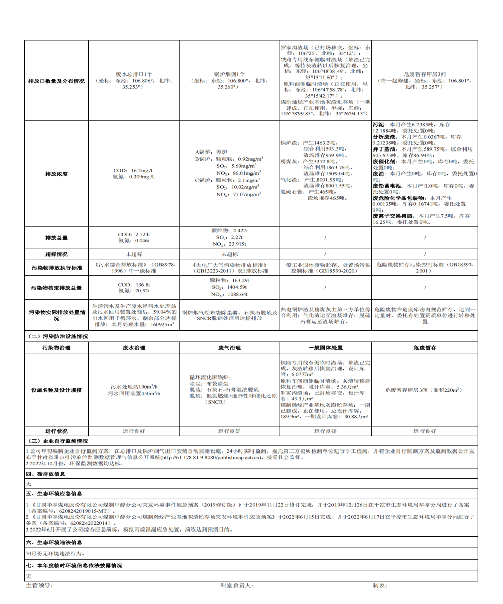 煤制甲醇分公司環(huán)境信息公開(kāi)內(nèi)容(2022年10月)